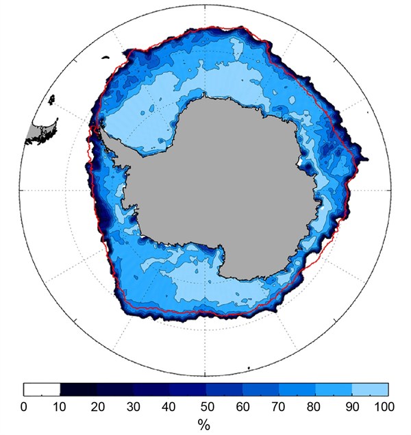 Antarctica sea ice extent on 20 September 2014. The red line shows the 1981-2010 daily average sea ice extent for that date. Image courtesy: American Meteorological Society.