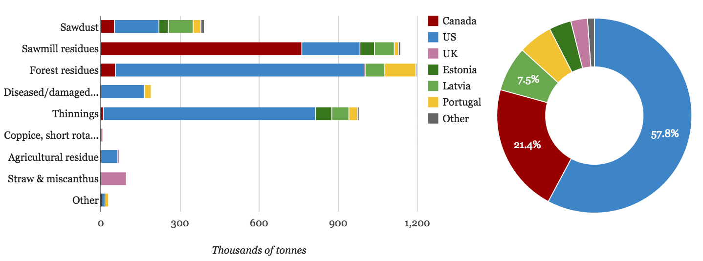 The chart above shows that the large majority of the wood pellets burnt by Drax last year came from sawmill residues, forest residues and thinnings, making up 81% of the total. We’ll explore what those categories actually mean in a moment.