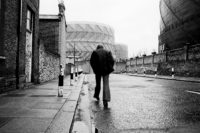 Oxford, UK. 10th January 2014. Man and dog on bridge cut off by flooding River levels in Oxford are at their highest levels since 2007. Credit: roger askew/Alamy Live News.